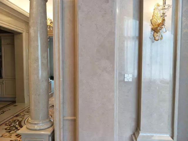 大理石浅灰色的基调在大吊灯的映衬下显得格外华丽而明亮,质感非凡的装饰品和绿色盆栽给空间注入了生机勃勃的色彩。