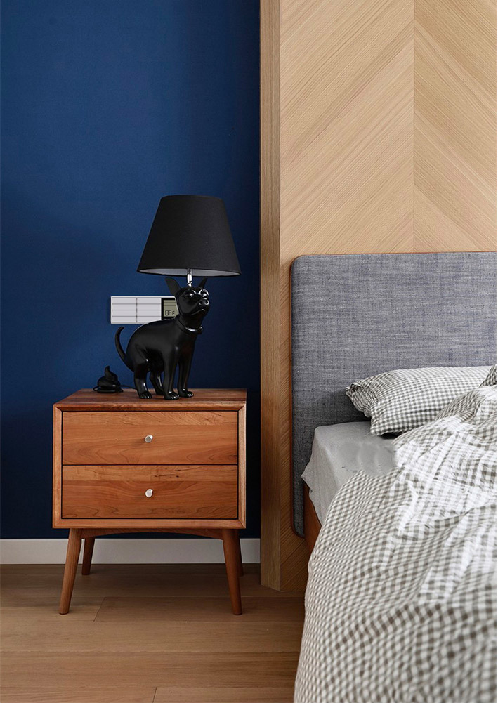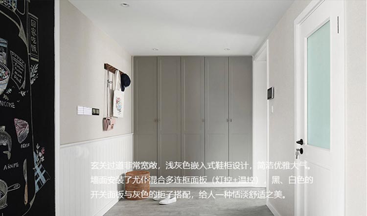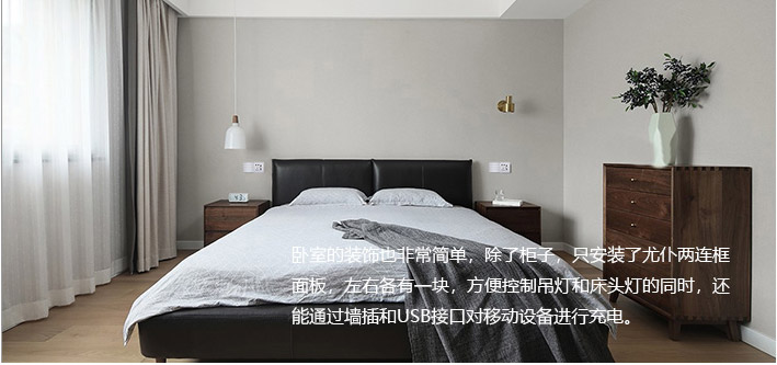 几间卧室的装饰也非常简单,除了几个柜子,只安装了尤仆两连框面板,左右各有一块,方便控制吊灯和床头灯的同时,还能通过墙插和USB接口对移动设备进行充电。