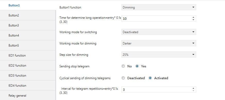 当选项为 “Activated” ,在长按操作时相对调光的报文会循环发送,发送时间间隔由参数“ Interval for telegram repetitions=entry*0.1s ( 3…30 )”设置。若选择“ Deactivated ”相对调光的报文仅发送一次。