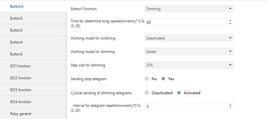 当选项为 “Activated” ,在长按操作时相对调光的报文会循环发送,发送时间间隔由参数“ Interval for telegram repetitions=entry*0.1s ( 3…30 )”设置。若选择“ Deactivated ”相对调光的报文仅发送一次。